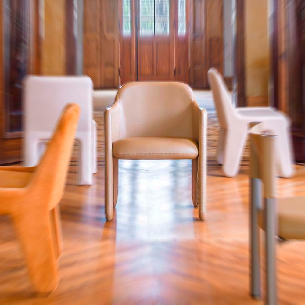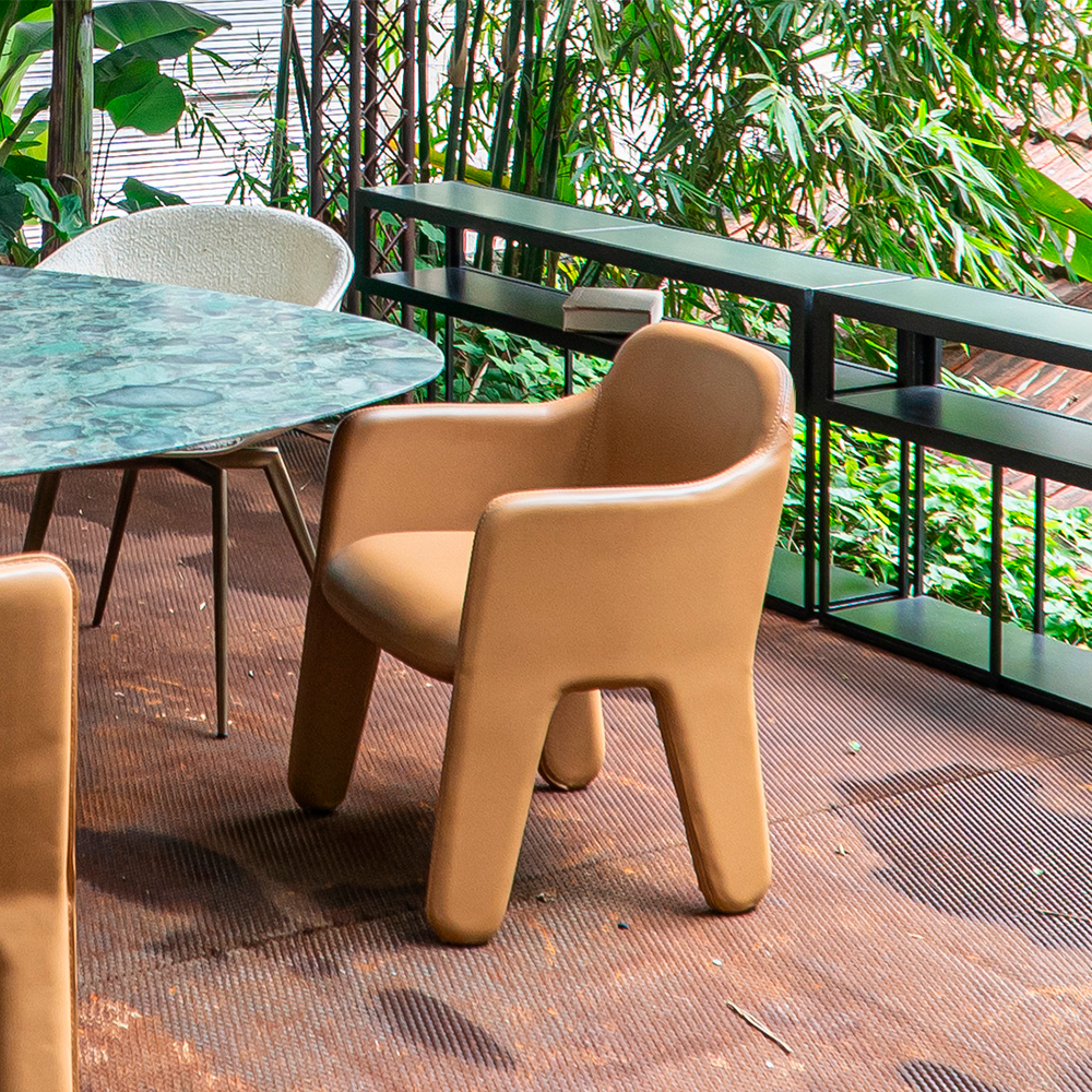Cadeira em metal revestida em couro ou tecido.