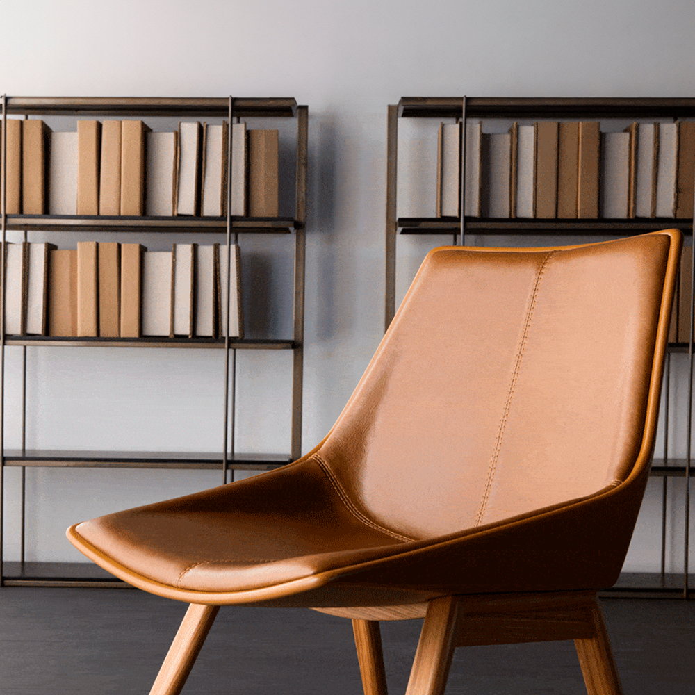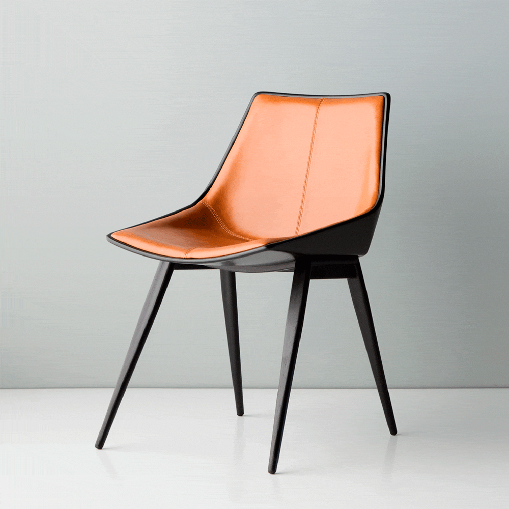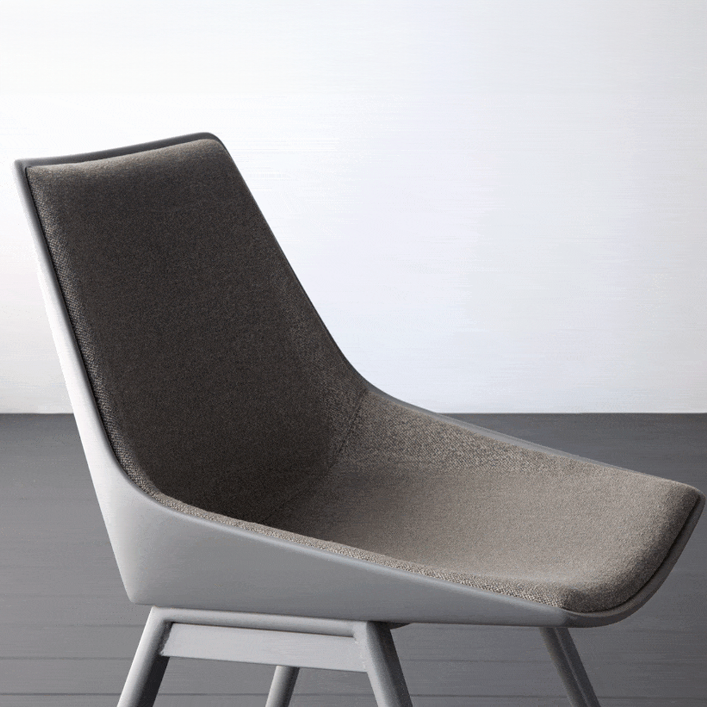 Cadeira em metal e fibra de vidro com assento estofado.