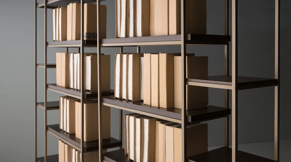 Estante em metal, madeira com opção de prateleira em couro ou pedra..