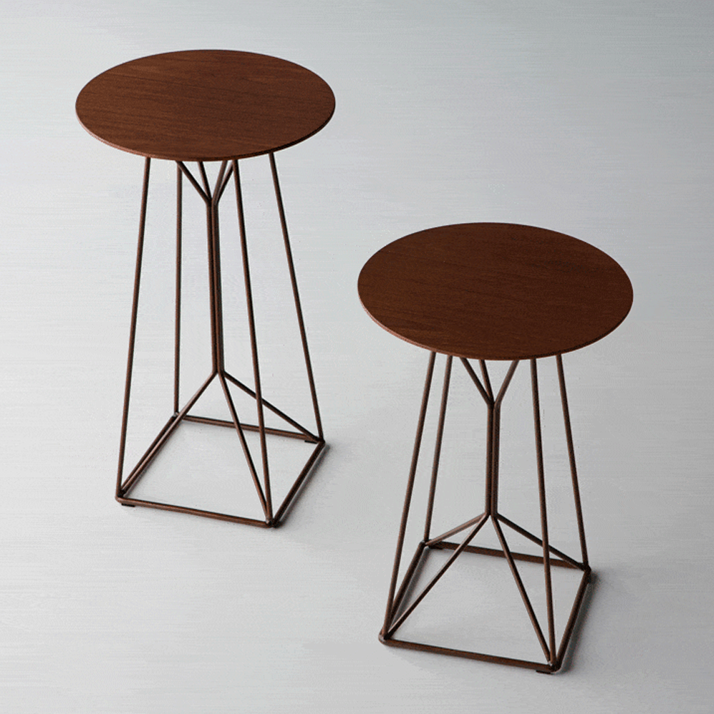 Mesa lateral em metal com tampo em madeira.