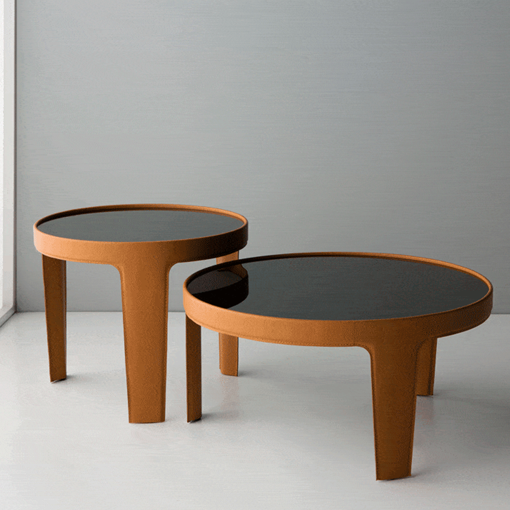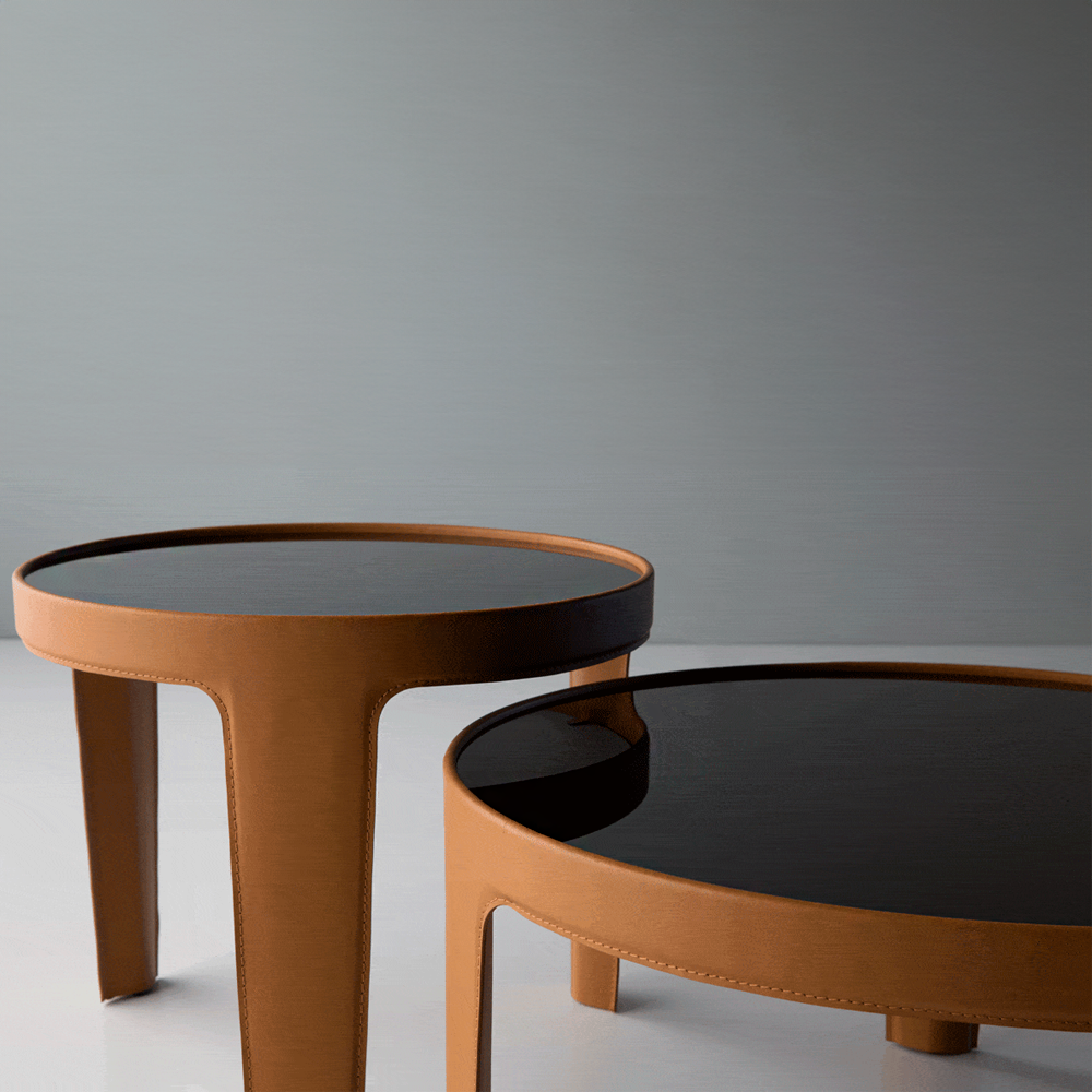 Mesa lateral em couro reconstituído e tampo em madeira ou vidro.