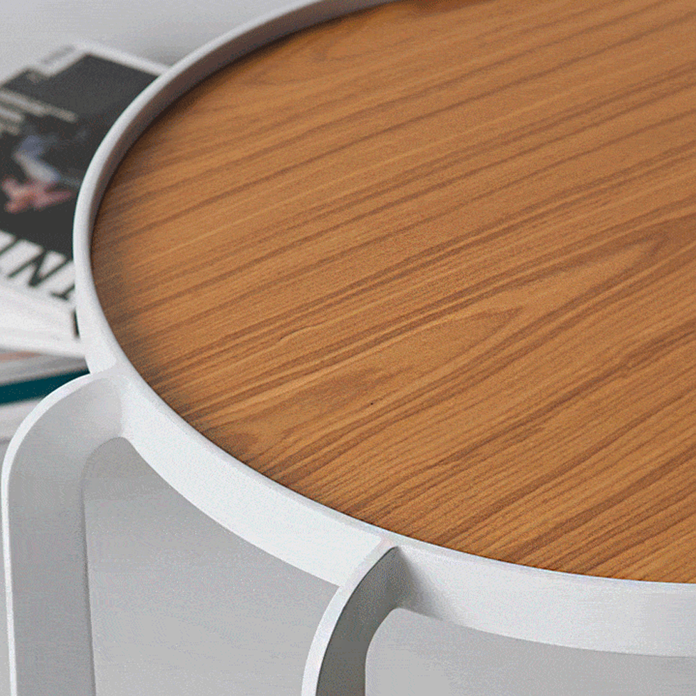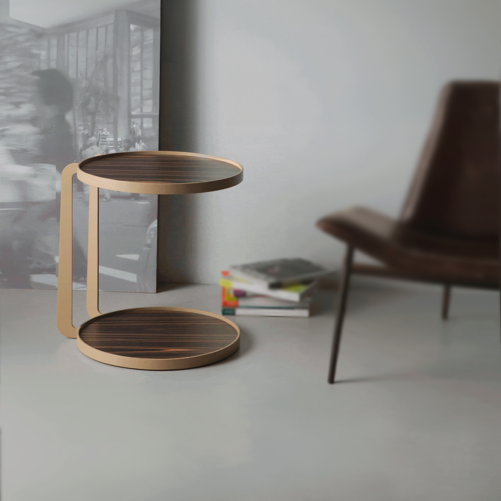 Mesa lateral em metal cortado a laser com tampo em madeira ou couro.