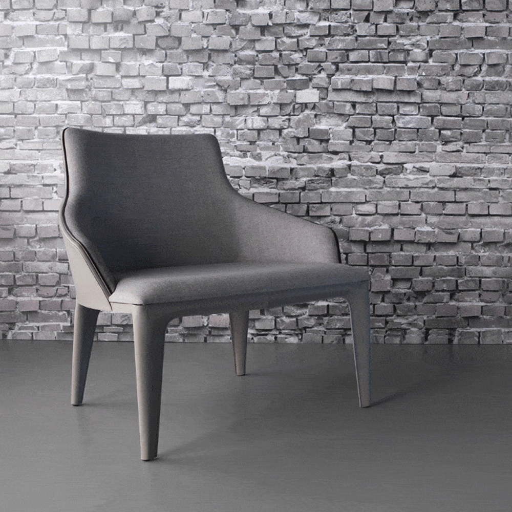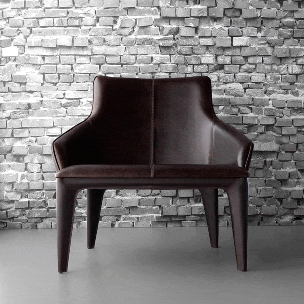 Poltrona em metal revestida com couro reconstituído e assento estofado.