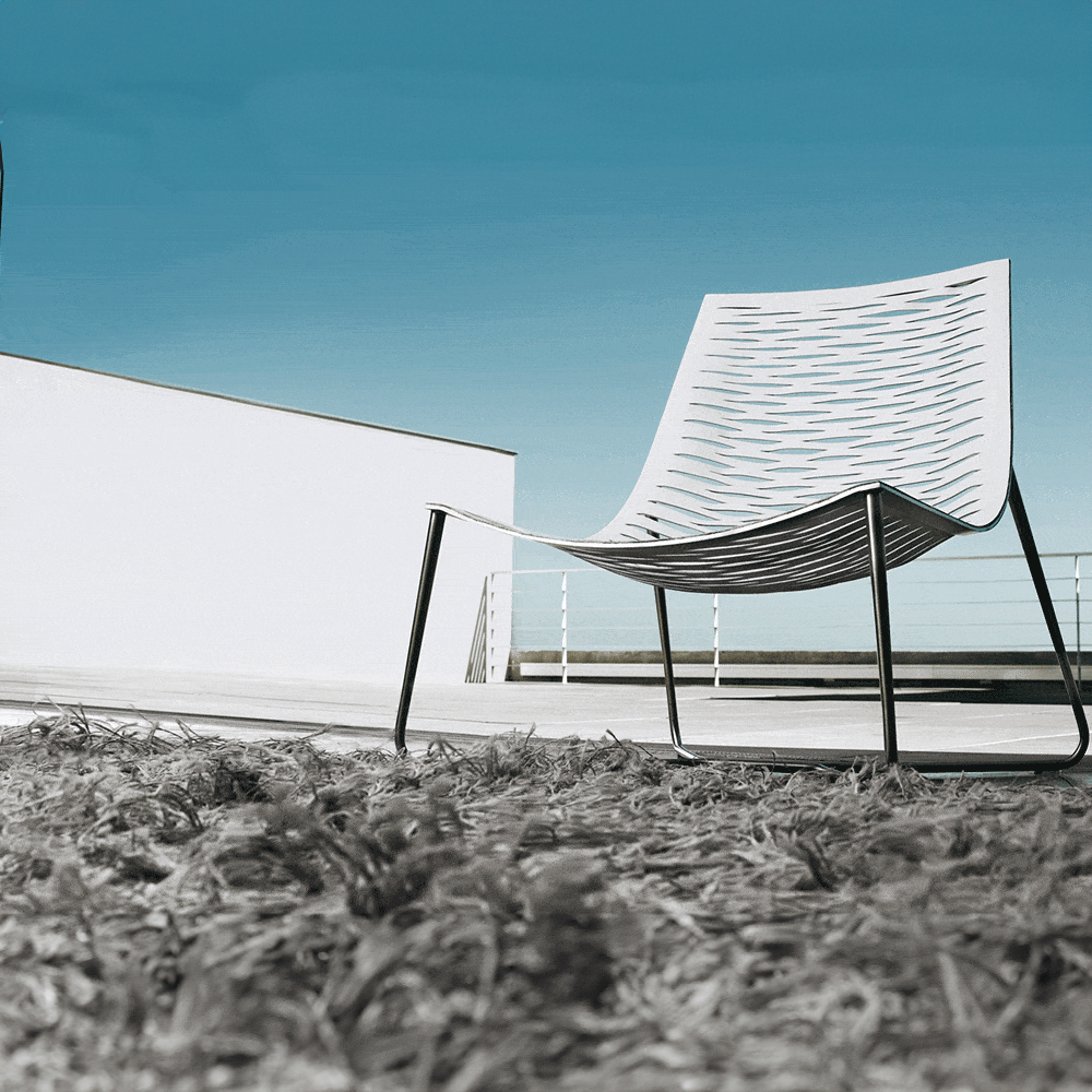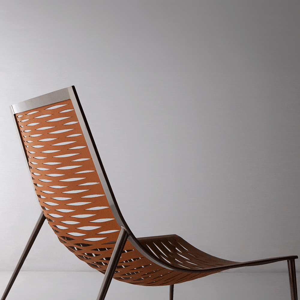 Poltrona em metal com assento em soleta natural.
