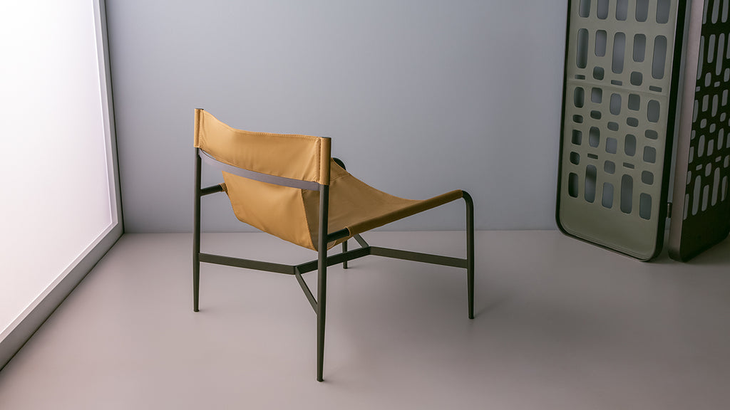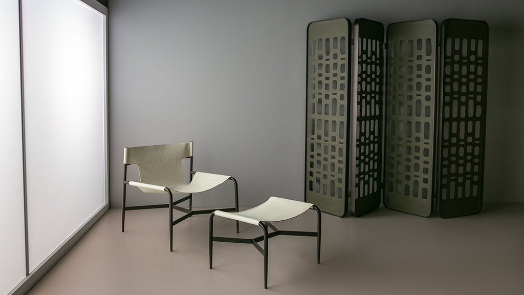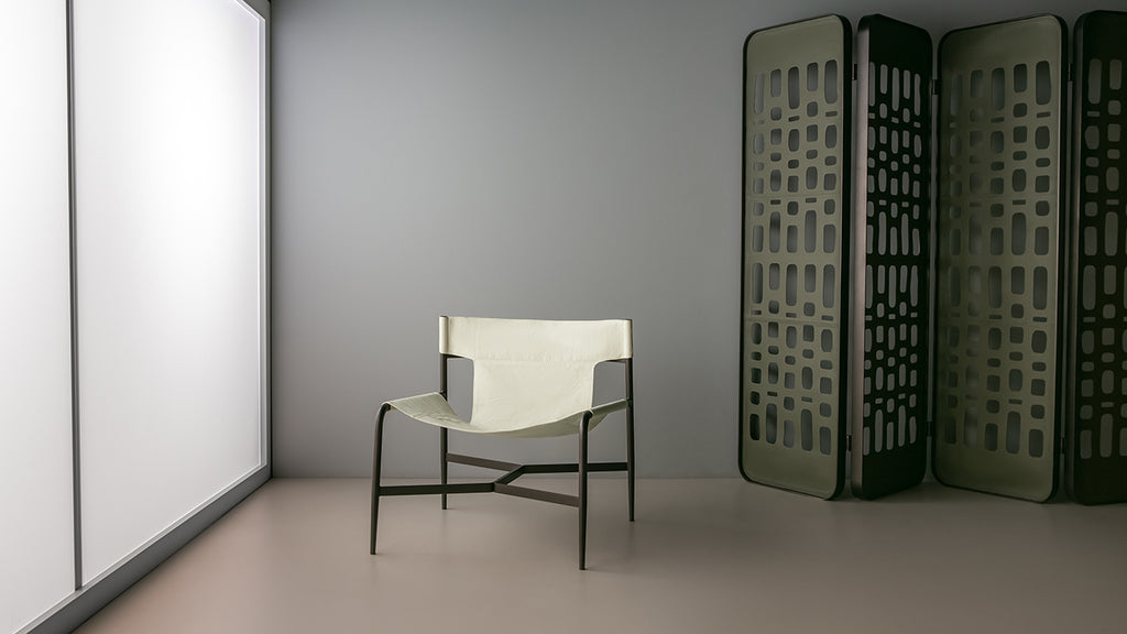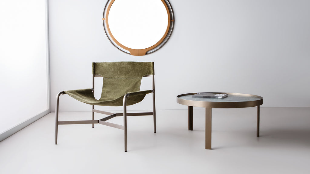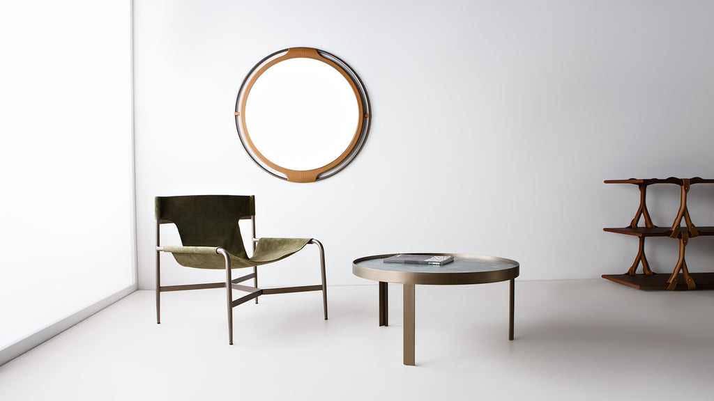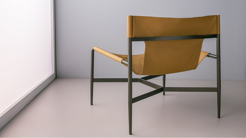 Poltrona em metal com assento em couro natural.