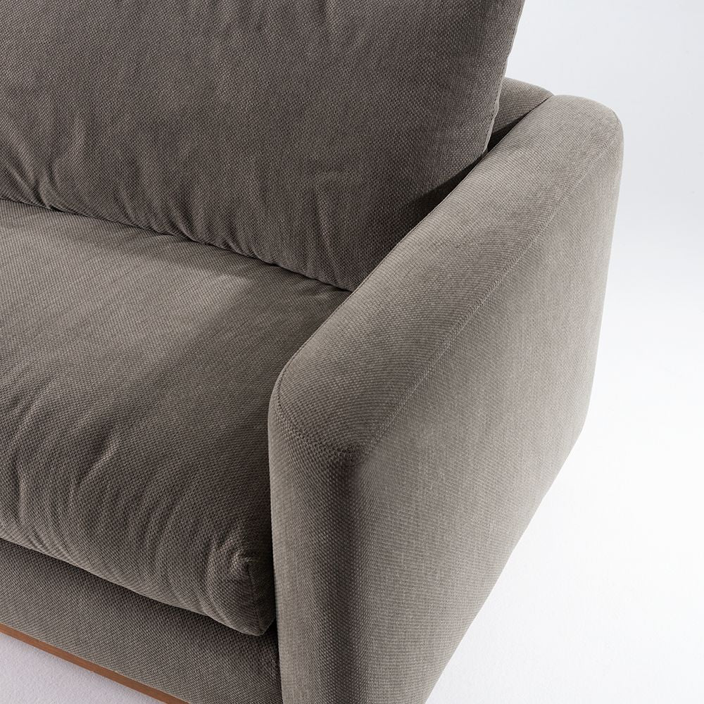 Assento fixo com espuma D28 e almofadas soltas com mix de espumas soft, contendo visco elástico.