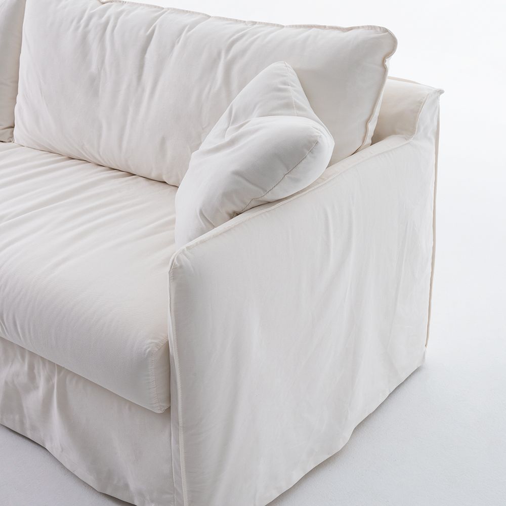 Encosto com almofada solta de fibra pluma. Sofá bipartido com capa sobreposta removível.