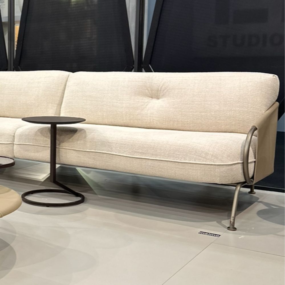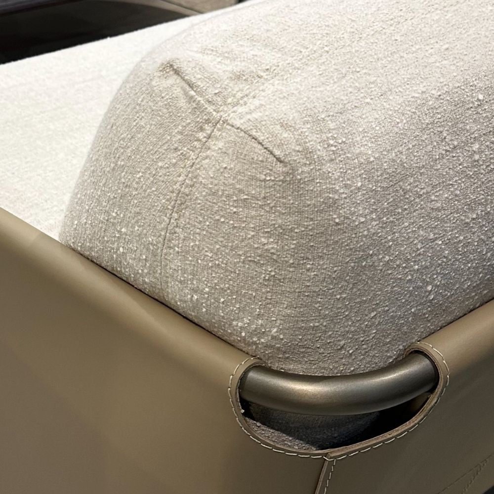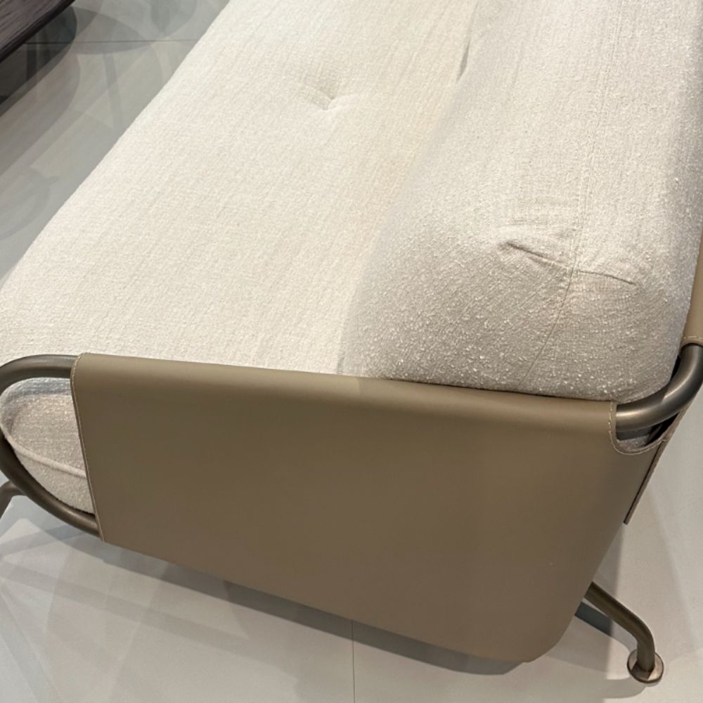Sofá em metal e couro reconstituído com assento estofado.